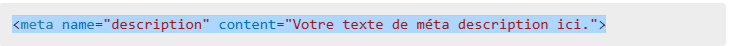 La méta description est une balise HTML qui fournit un résumé du contenu d’une page. Elle se présente sous cette forme dans le code source :